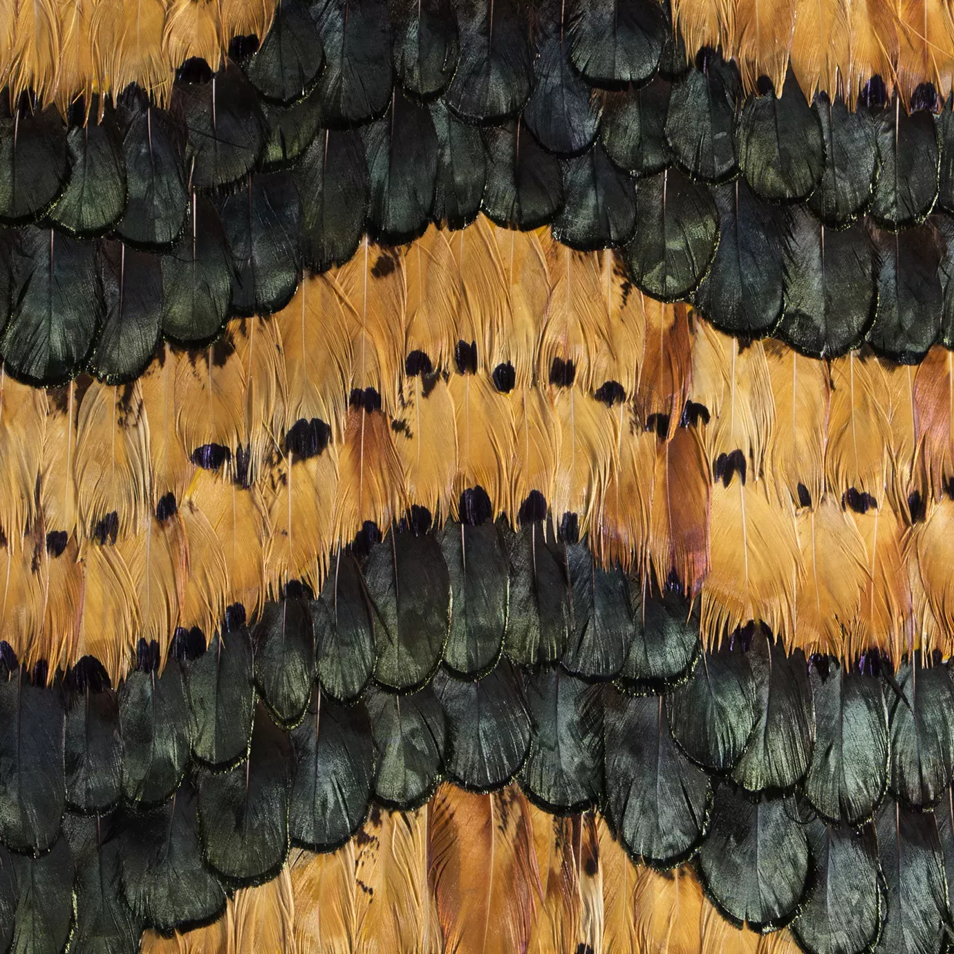 Close view of the Divine Peacock & Pheasant Caramel Feather Armoire front doors, showcasing the delicate caramel and dark green peacock and pheasant feather that cover the doors, as well as the black metal ribbon handle.