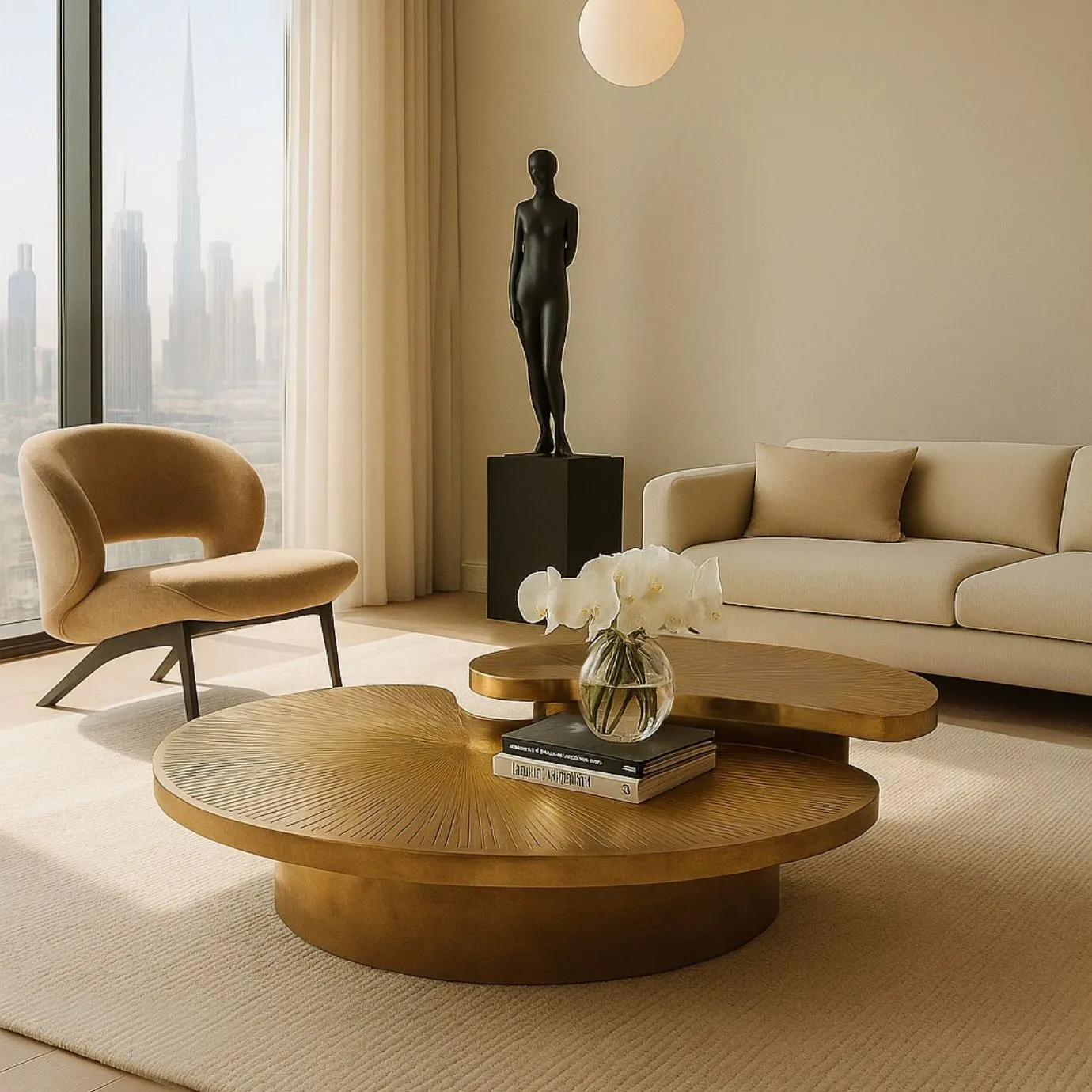 Radiant glamour emanates from the Myth Cocktail Table as two individual brass parts set at varying heights with a shared sun-burst etched top unite creating a statement work of furniture art.