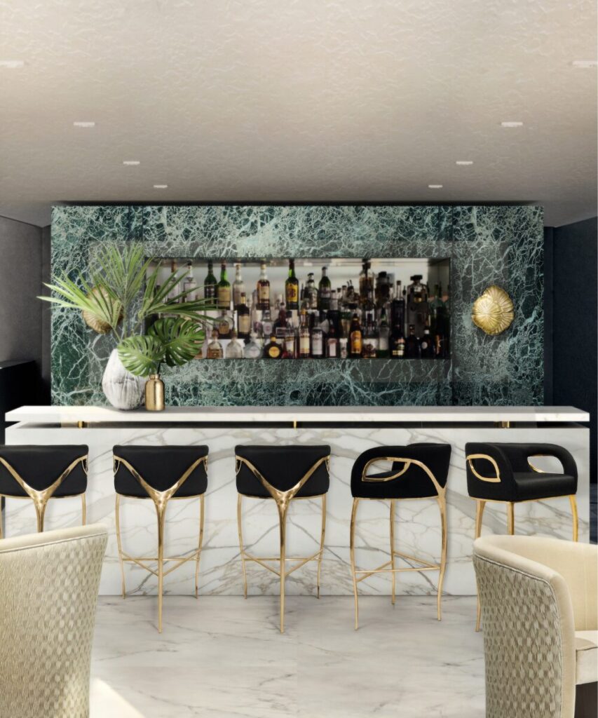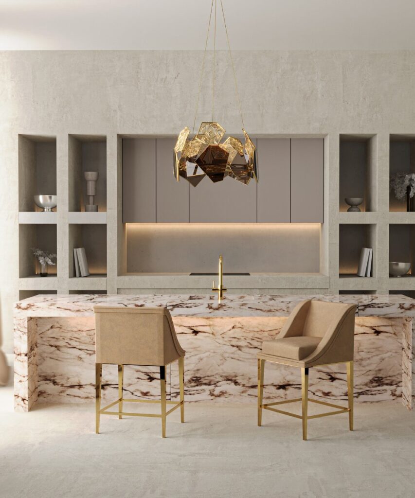 With its sensual curves and polished metal bands, the Chandra Bar Stool brings vintage glam and contemporary boldness to the kitchen island. Moreover, its sculptural brass details and tight upholstery make it the perfect piece to glamorize a brass kitchen with elegance and confidence.